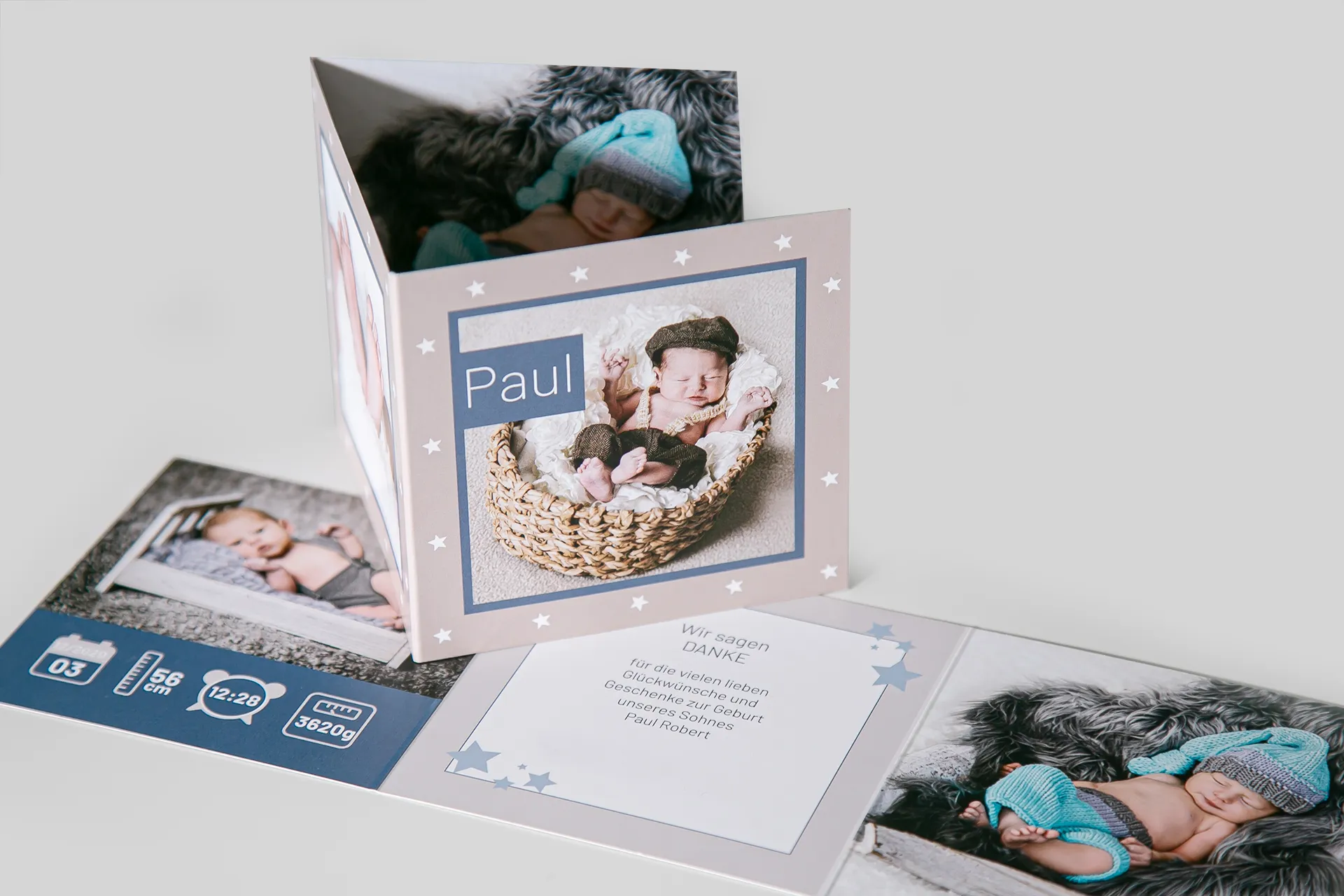 Eine hübsche Karte, um sich bei Verwandten, Bekannten und Freunden für Geschenke zur Geburt oder Taufe zu bedanken. Die Babykarten werden von mir individuell gestaltet und sind in verschiedenen Ausführungen erhältlich - ob DIN-Formate oder Quadrate, fast alles ist möglich!