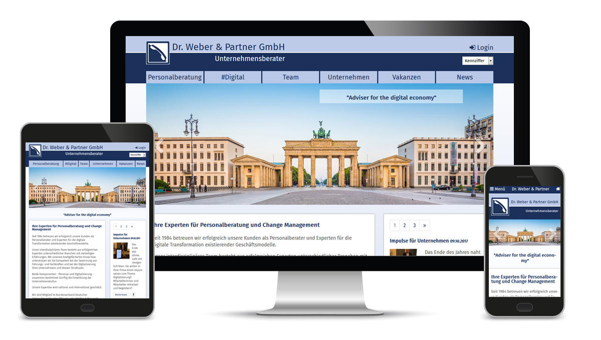 Die Personal- und Unternehmensberater Dr.Weber & Partner in Frankfurt bekamen neben einer neuen Webseite auch zusätzlich eine Stellendatenbank sowie ein Bewerberportal. Interessenten können sich neben der klassischen Anfrage per E-Mail auch im System registrieren, ihre Unterlagen uploaden und sich somit für mehrere Stellenangebote gleichzeitig bewerben. Dazu können die Mitarbeiter von Dr.Weber & Partner einfach selbst Stellenanzeigen verwalten.